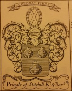 Escalops are the proper figures of those of the surname of PRINGLE, whose first ancestor is said to be one Pelerin, a famous pilgrim in the Holy Land, who came to Scotland, and the descendants from him were called at first Pilgrims, and afterwards by corruption Pringles. The ancientest family of the name I have met with in Teviotdale, where the name is most numerous, is HOP–PRINGLE of that ilk, now designed of Torsonce, argent, on a bend sable, three escalops or: crest, an escalop as the former : motto, Amicitia reddit honores, (as in Plate of Achievements) supported on the dexter by a deer, and on the sinister by a greyhound argent, with collars about their necks sable, charged with escalops or ; and upon the compartment are these words, Pressa est insignis gloria facti. I have seen a charter of Robert de Lauider, miles, Dominus de Quarlewood, to Thomas Borthwick, of some lands about Lauder, in the reign of King Alexander III. to which charter Thomas de Hoppringle is one of the witnesses ; and I have met with an evident in Haddington’s Collections, where King David the Bruce gives all the lands belonging to Walter de Pringle, forfeited, lying in the shires of Teviotdale and Berwick, to John Petillock, brother to William Petillock, miles.