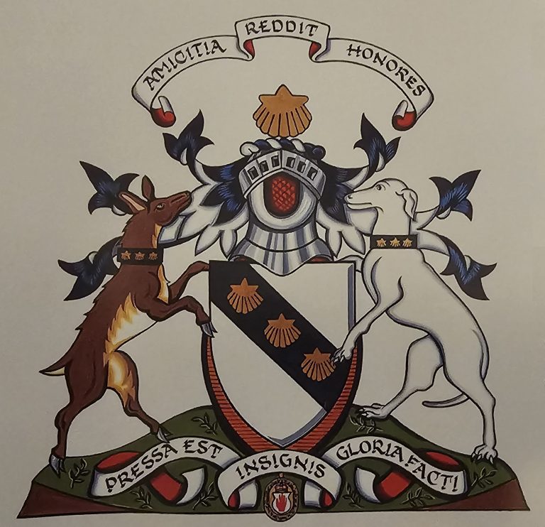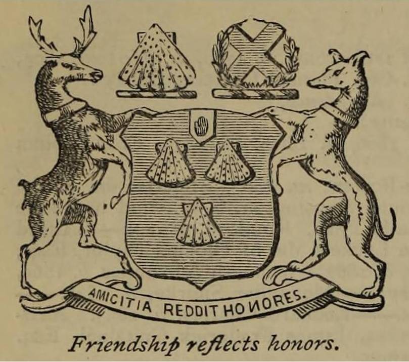 Ensigns Armorial: Argent, on a bend Sable, three Escallops, Or; Above the Shield, which is environed of the badge pendent by its proper ribband of a Baronet of Nova Scotia, is placed an Helm befitting his degree with a mantling Sable doubled Argent, and a Wreath of the Liveries is set for Crest an Escallop as the former, and in an Escrol over the same this motto “AMICITIA REDDIT HONORES”. On a compartment semee sprigs of elder leaves bearing the words “PRESSA EST INSIGNIS GLORIA FACTI” are set for Supporters dexter a deer proper, and sinister a Grey-Hound Argent and collared Sable charged with Escallops Or,