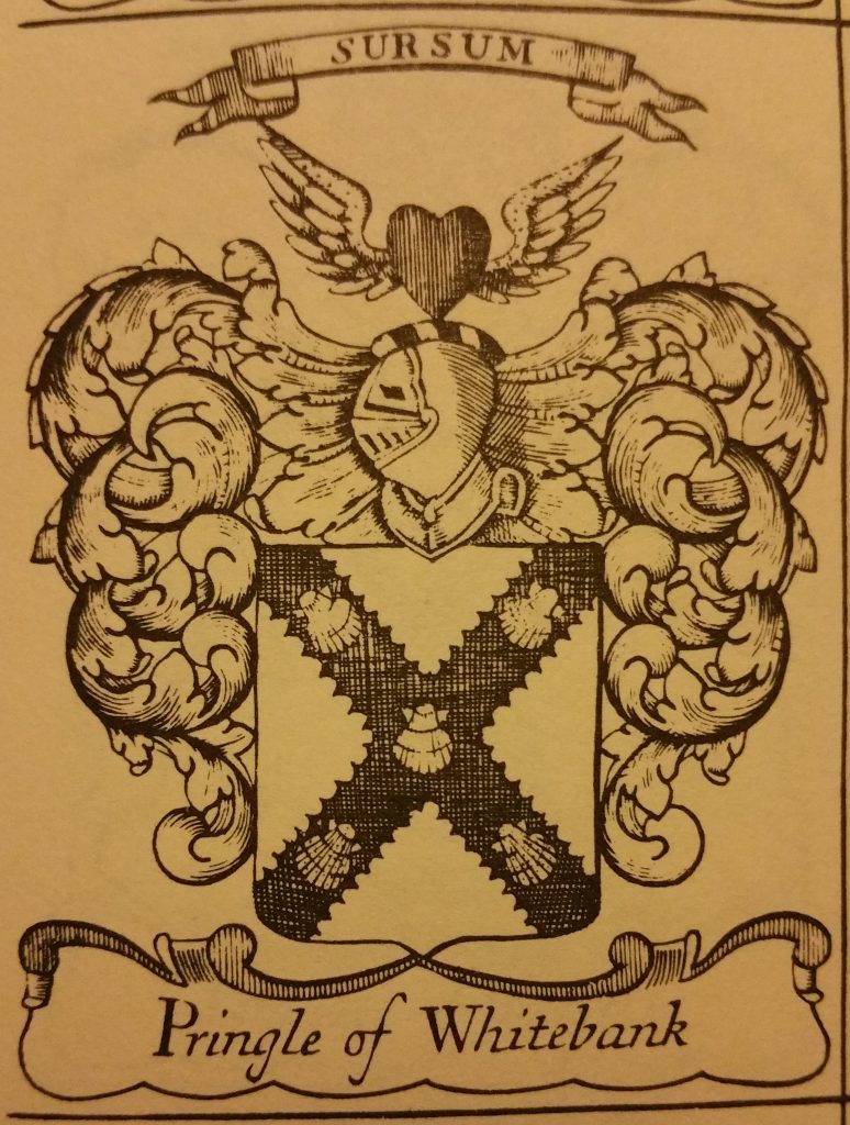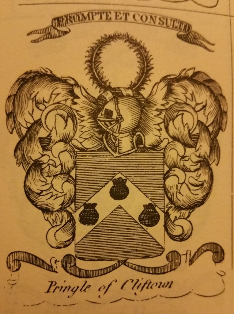 In 1693 Andrew Pringle of Clifton was granted Arms and they were recorded in the Lyon Register. So were the Arms of John Pringle, Lord Haining in 1731 and also the Arms of Sir Walter Pringle, Lord Newhall in 1733. Then the Arms of Mark Pringle of Crichton in 1743.