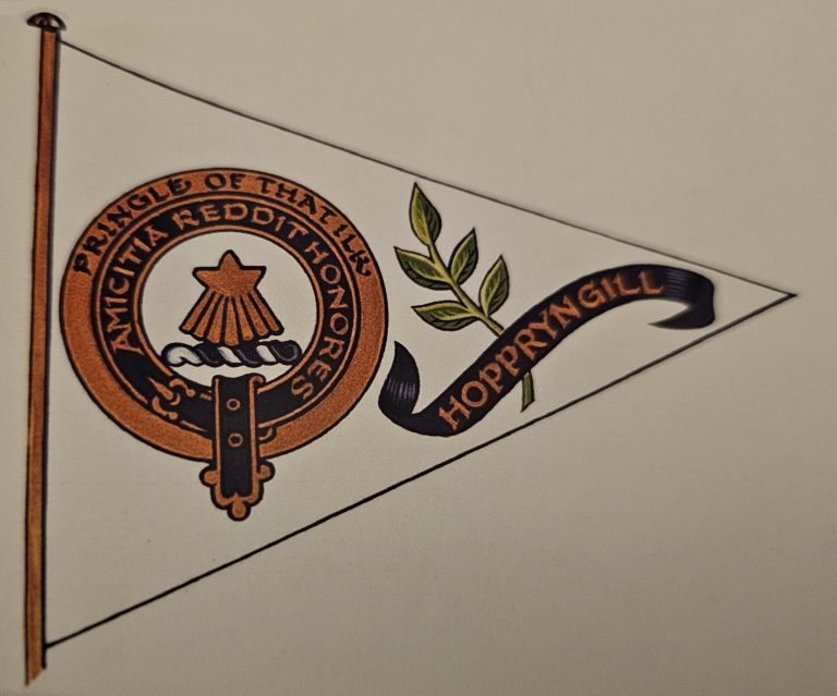 In 1672 the Scots Parliament passed a law requiring armigerous individuals to register their Arms within a year. In 1673 the Pringles of Stitchell, Greenknowe, Whytbank and Torwoodlee all duly registered their arms in the Public Register of the Lord Lyon. None of these four branches of the clan matriculated supporters to their arms. George Hoppringle of Torsonce (and that ilk) was a soldier and was away with the army so did not matriculate his coat of arms.
