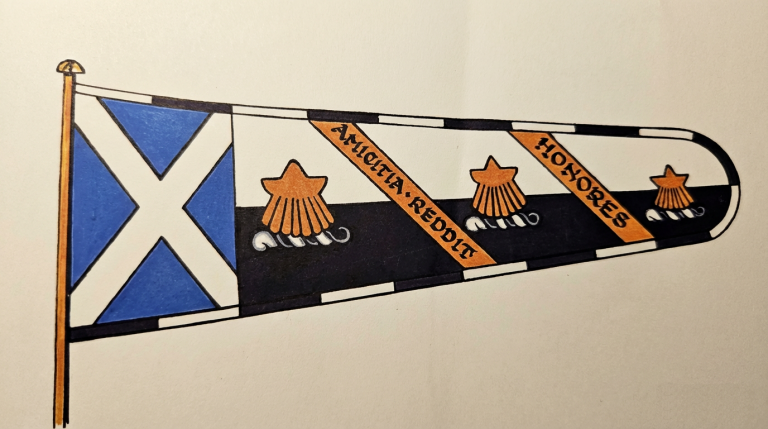 Standard: and upon a standard of four and a half yards in length parted in two Argent and Sable with the St Andrew’s Cross in the hoist is depicted the Petitioner’s said Crest three times in the fly with the motto “AMICITIA REDDIT HONORES” in Sable upon the transverse bands Or;