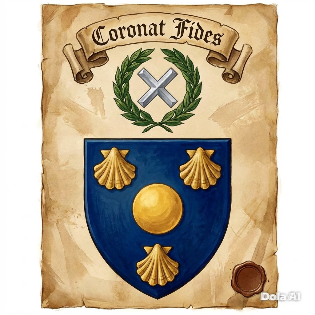 Robert Pringle of Stitchell (12 Sep 1673), Vol. I. p. 203. Bears azure three Escalops Or, above the shield a helmet befitting his degree, mantle glues doubled argent. Next is placed on an torse for his crest, a St Andrews cross within a Garland of bay leaves proper. The motto is an Escroll, Coronat Fides.